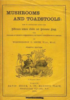 The above illustrations show the cover (and enlarged detail) of the 4th edition of Worthington G Smith's Mushrooms and Toadstools: How to distinguish easily the differences between the Edible and Poisonous Fungi, published in 1879 by David Bogue, London. This book of 64 pages is a simple guide to some common species and the book's linen cover is about 12.5 centimetres across and 17 centimetres in height. The cover drawing is by the author.