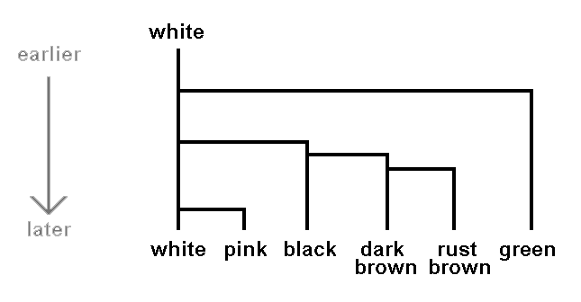 Let's illustrate this with a hypothetical example. Suppose that white, pink, green, rust brown, dark brown and black are the only spore colours found in mushrooms today. Suppose we know that all mushrooms had white spores until ten million years ago when green spores appeared in one population and all the descendents of this green-spored population have been green-spored. Some time later a population of the white spored mushrooms then extant gave rise to mushrooms with black spores. Later still some of the descendents of these mushrooms with black spores developed dark brown spores, while the other descendents continued to have black spores. Then some of the mushrooms with dark brown spores gave rise to mushrooms with rust brown spores while the other descendants had dark brown spores. Finally suppose that more recently still some of mushrooms still with white spores gave rise to mushrooms with pink spores and the descendents remained pink-spored. We could present this hypothetical scenario by the following diagram, where the arrow on the left indicates time.