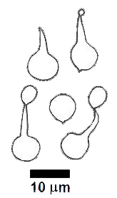 There is also considerable variety in spores, for they may be smooth or ornamented, vary in shape from spherical to highly angular, be white or coloured when viewed in mass (as in a SPORE PRINT) and one-celled or septate. The following drawings show some of the variation of form in spores.