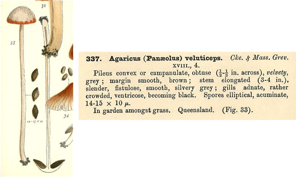 On the left is part of Plate 5, showing figure 33, and on the right is Cooke's description of Agarics (Panaeolus) veluticeps, a small-capped, slender-stemmed mushroom. Figure 33 is composed of several illustrations: one upright mushroom, one upside down mushroom (cut in half to show the gills) and between the two mushrooms there are three dark spores.