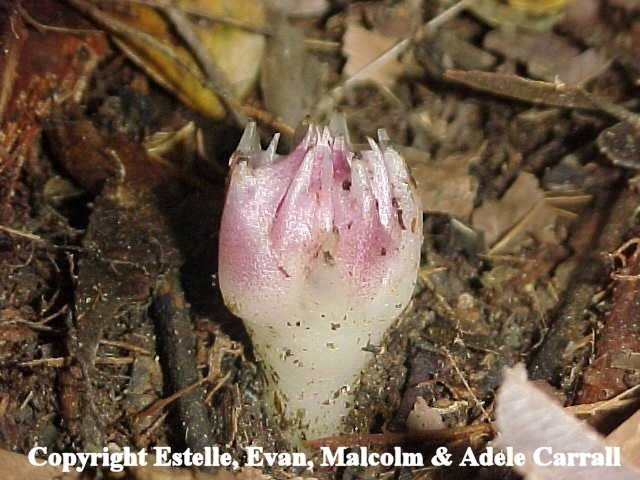 In Australia the orchids Gastrodia sesamoides (the Potato Orchid), Dipodium punctatum (the Spotted Hyacinth Orchid) and the two species of the genus Rhizanthella (Rhizanthella gardneri and Rhizanthella slateri) lack chlorophyll. The Rhizanthella species are unusual because they are underground orchids, whereas both Gastrodia and Dipodium produce above-ground flower spikes. The fungi involved in these associations are quite varied, both in terms of species and lifestyles. For example the species of Gastrodia (both in Australia and overseas) are associated with species of Armillaria (a genus of virulently parasitic fungi, which the orchids manage to keep under control). The Western Australian underground orchid Rhizanthella gardneri forms an orchid mycorrhiza with a fungus that also forms ectomycorrhizas with Melaleuca (one of the Australian native Tea Trees). Incidentally, this also shows that some fungi can form more than one type of mycorrhiza. The eastern Australian species, Rhizanthella slateri, pictured here, has been rarely seen. It was discovered in 1931 on Alum Mountain, in Bulahdelah on the New South Wales north coast, and these photos (taken in 2002) are also of specimens growing on Alum Mountain. The fungal associate of this species is unknown.