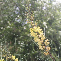 Acacia subulata has fine foliage and scented yellow balls of flower for long periods of time. Flowers open sequentially towards the tip.