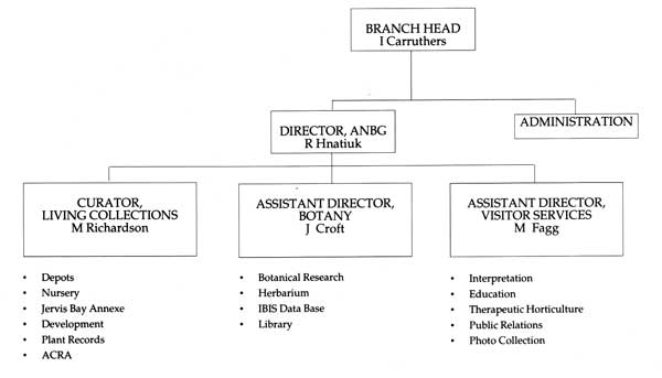 The Gardens forms part of the Natural History Branch of the Department of the Arts, Sport, the Environment, Tourism and Territories (DASETT). The Bureau of Flora and Fauna (BFF) is also located at the Gardens. The component groups of the Natural History Branch will be amalgamated with the Australian National Parks and Wildlife Service (ANPWS) on 1 July 1990