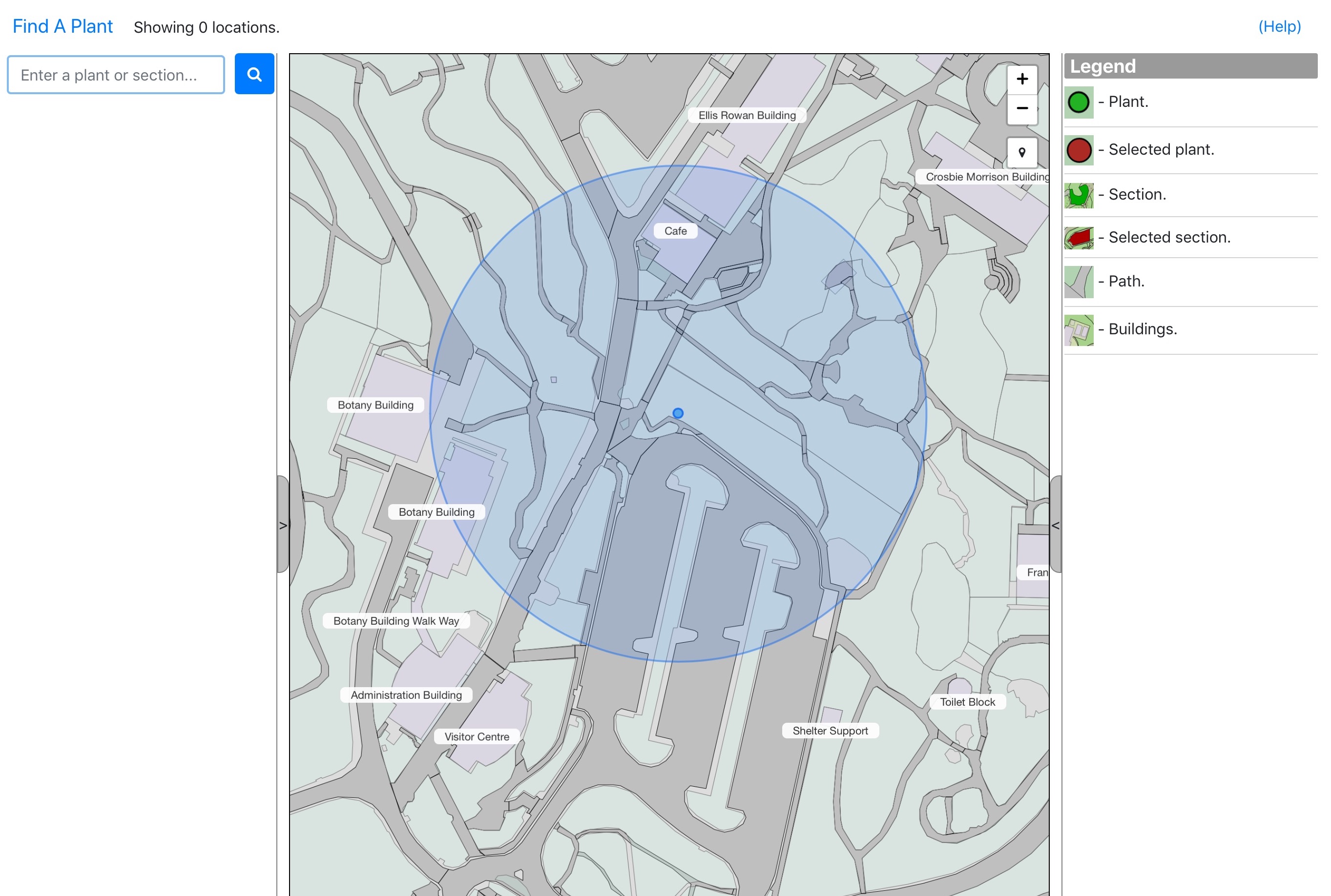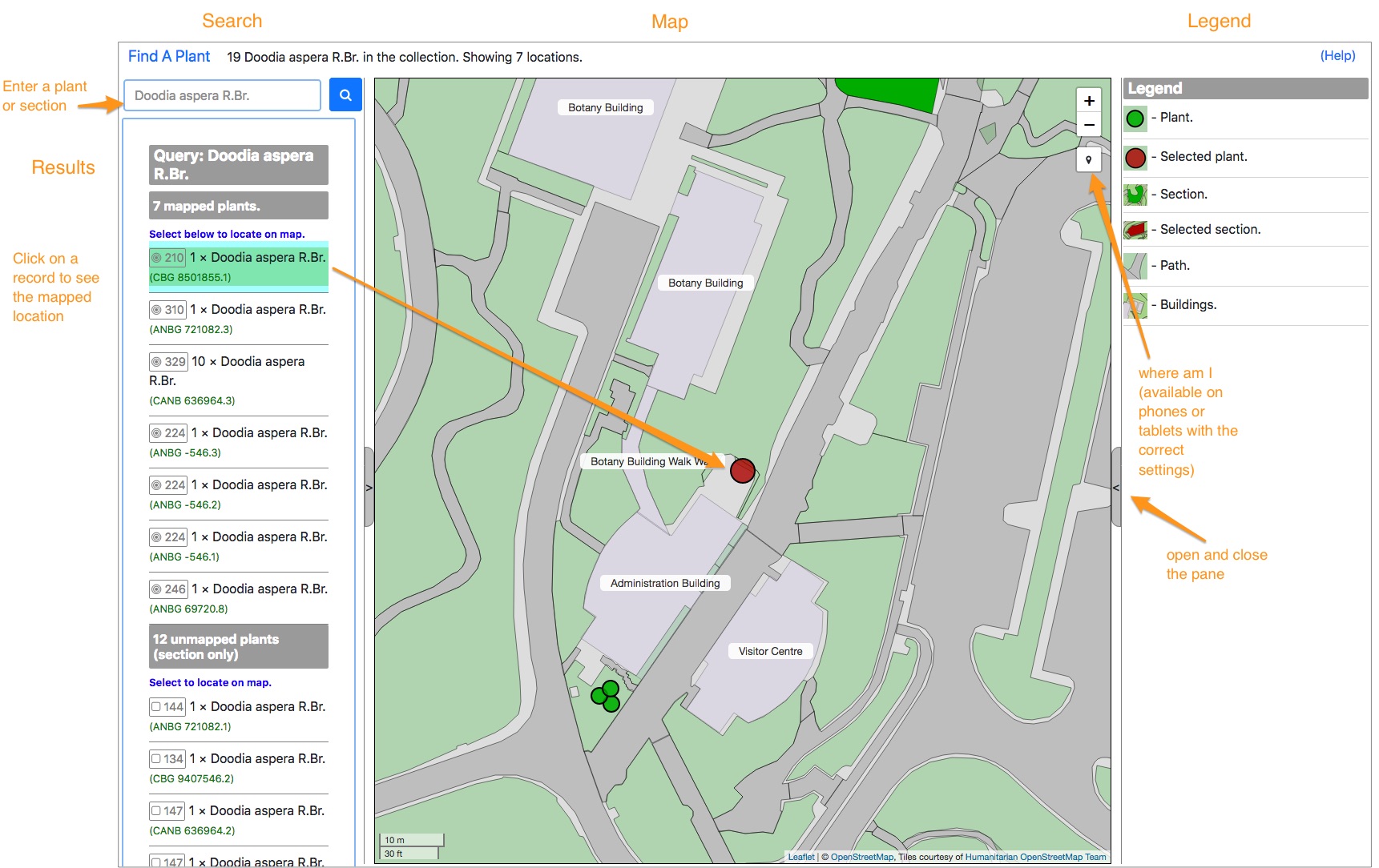 The Find A Plant application will show all plants that are in sections that are marked as publicly available. Some areas such as around the Nursery are not displayed and permission is required to view plants in these areas. The data displayed is reliant on the Living Collections system and changes to records are made available at least nightly. While staff endeavour to keep the data up to date, at times there may be some inconsistencies between the data presented through the application and the plants growing in the Gardens (e.g. a section is undergoing redevelopment, plants have been removed, or new plantings added).