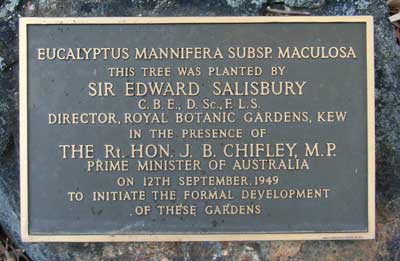 On 12 September 1949 during a visit by an international delegation of foresters, the Australian National Botanic Gardens were 'officially' started with the planting of an oak and a eucalypt by the Director of Kew Gardens, Sir Edward Salisbury, and the Prime Mininster of Australia, Ben Chifley.