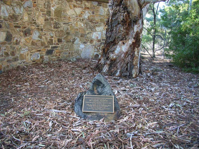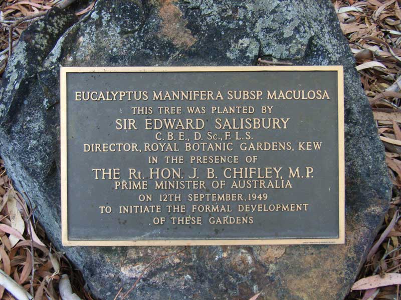 The plaque next to the Eucalyptus mannifera was placed there in the 1980s, the original plaque stating that Chifley planted the eucalypt. This plaque was replaced by the currrent one when the above photo came to light clearly showing Chifley planting the oak.