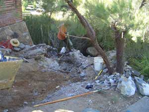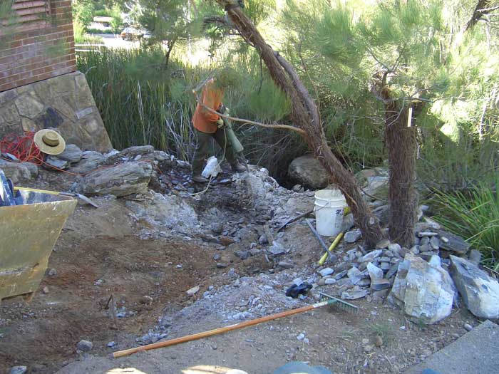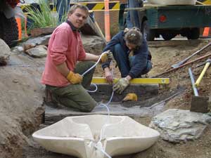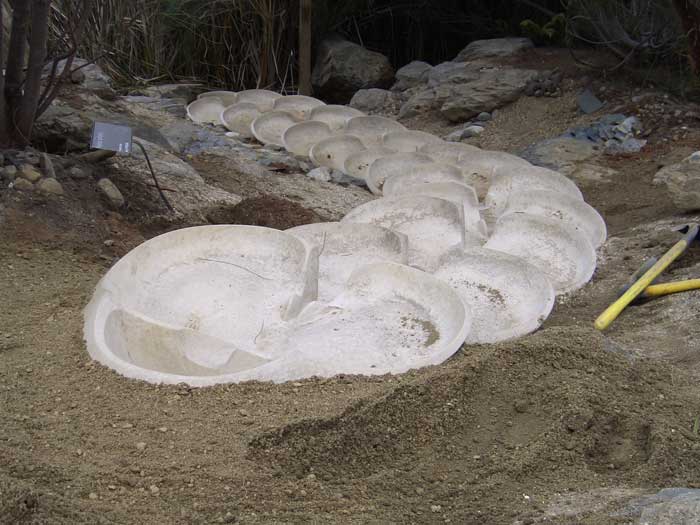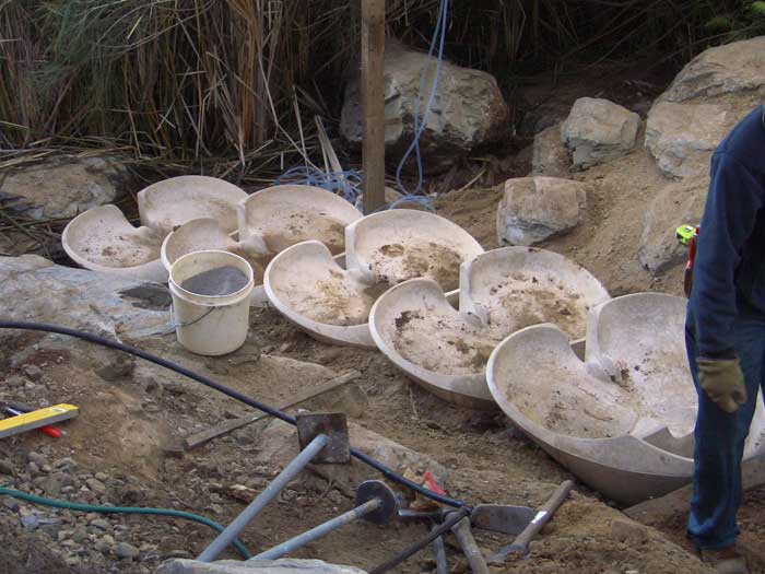 Often Flowforms are set up on an ‘industrial’ looking frame above the ground, when used commercially for treating effluent, grey water recycling, stirring bio-dynamic preparations and so on. ‘We wanted to have the cascade fit snugly into the immediate landscape and so constructed the series of Flowforms using the slope to advantage, a stylised version of a creek bed if you like’.