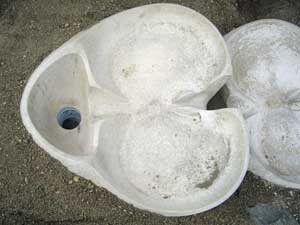 Flowforms take many sizes and shapes, with certain common characteristics: a smaller entry "bowl" which receives water from the source or the Flowform above, from which it flows into two larger basins where the figure of eight movement takes place, then an outlet through which the flow drops to the next Form. The size and positioning of the entry bowl, its outlet, the larger basins and their outlet and the shaping of the surfaces over which the water flows is what does the "coaxing" referred to above.