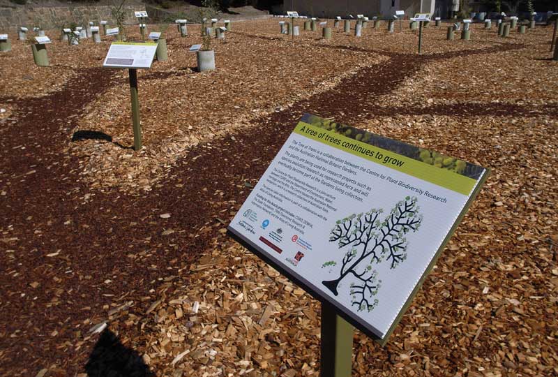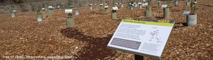 At the display you can start at the base of the tree and walk up the tanbark trunk and then venture out on a limb. Each plant is labelled with a species profile. There are also 12 interpretation signs in the display that help describe the work and note interesting lineages of Acacia. Also at the display are 4 species which are unlabeled and you can test your identification skills by finding them in the display.