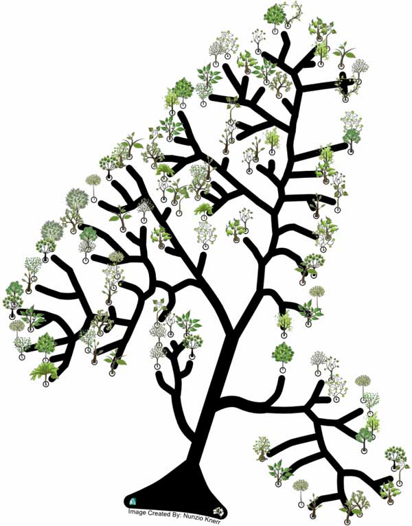 We commonly represent these DNA sequence data as a 'Phylogenetic Tree', basically a branching diagram, similar to a family tree, with closely related species connected by short branches and more distantly related species connected by long branches. This 'Tree of Trees' project currently running at the Australian National Botanic Gardens (ANBG) displays over 100 species of Acacia trees (and shrubs) in the shape of a ‘phylogenetic’ tree with live potted plants representing the species and mulched paths marking the branches between species. The closer one species is to another on the tree, the more closely related the two species are. The display indicates the enormous diversity of related Acacias, as quite often two very different looking species can actually be closely related.