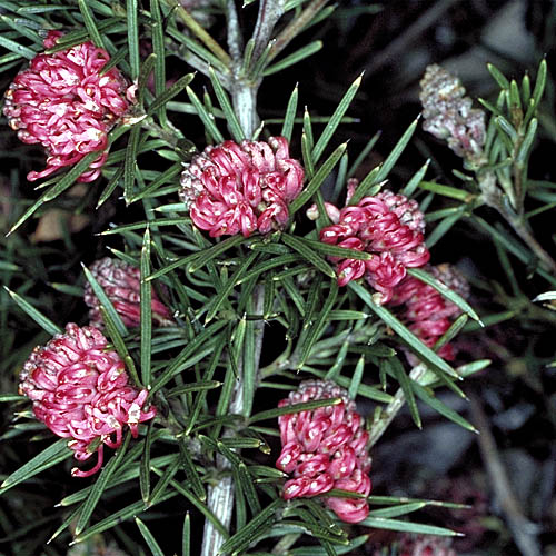 The shrub Grevillea confertifolia is commonly known as Grampians Grevillea or Dense-leaf Grevillea. It belongs to the Proteaceae family which includes the banksias and waratahs.