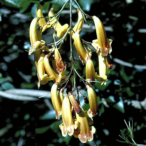 The seeds of this cultivar germinate freely and many adventitious seedlings have appeared at the Gardens. Although plants can be raised from seed, this form of propagation will not guarantee flower colour. To retain the characteristics of 'Golden Showers', or for that matter any other desired colour form, vegetative propagation must be used. Tip cuttings of medium-wood material are suitable. Though found naturally in a wide range of environments, cultivation at the Gardens has shown that Pandorea 'Golden Showers', like other forms of the species, performs best in richer soils with some year-round moisture. Soils should not dry out nor should the plants be subjected to extensive soil moisture fluctuations. Plants develop to their full potential in semi-shaded situations. It is an excellent species to use on fences, pergolas or trellises. If desired for use as a climber on trees, some care must be exercised due to the constrictive liana habit as this may inhibit or strangle younger trees as they develop.