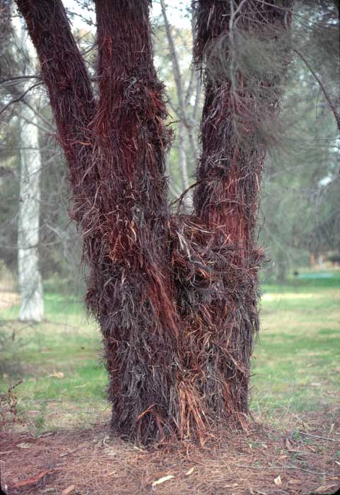 The most significant horticultural value of A. inophloia is the hairy, shaggy, dense appearance of the bark on the trunk and lateral branches. This feature makes for a unique aesthetic quality. The common names for A. inophloia, Woolly Oak or Stringybark She-oak, are derived from this feature. Additional features for horticultural appeal include the open canopy allowing for part shade within a garden environment and for stimulation of another sense, the sound of the wind whispering through the canopy.