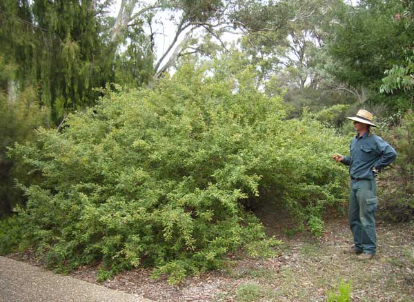 Its scarlet flowers occur in groups of up to 20, mostly in winter-spring, but there will be a few on the shrub in groups of about four all year round. Being scarlet, they can be expected to attract birds to your garden. Because the flowers are small and blended amongst the foliage, the effect of their scarlet colour is subtle rather than a dominating, scarlet statement in the garden.