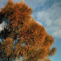 To cultivate Allocasuarina distyla, collect mature unopened cones and place them in a paper bag for 3 to 4 days in hot dry weather, or longer in cool weather. Seeds drop into the bag and can be planted immediately or at any time of the year. Seeds should be planted with good soil at first, once established they can be planted into any soil type. Sandy soil is the least preferable as it increases susceptibility to insect attack. Adult plants need no extra watering but seedlings require water until they are a few feet tall. Fertilizer may be used but is not necessary because like wattles and members of the pea-family, Allocasuarina ‘fix’ atmospheric nitrogen through nodules on their roots, enriching impoverished soils.