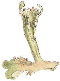 Metus conglomeratus and Neophylllis melacarpa have already been mentioned on the BIOGEOGRAPHY AT DIFFERENT LEVELS page as examples of Australia-New Zealand species but it is worth giving some more information about the former. The first description of the species Metus conglomeratus was published in 1889 by the Reverend Francis Wilson, who gave it the name Pilophoron conglomeratum. The description was based on material collected in southern Victoria, yet the species appears to be commoner in Tasmania and New Zealand. There are many plant or cryptogam species that are found in New Zealand and Tasmania (and perhaps southern Victoria as well) and for many years Metus conglomeratus appeared to be a good example of such a species but in 1997 (based on specimens that had been collected in 1990) it was reported from Lamington National Park in south-east Queensland. When fertile the species is quite distinctive, with the apothecia atop a typically green-granular podetium, but the thallus is rather indistinct and granular, which means that sterile specimens could be overlooked easily - so the species may be more widely distributed in Australia.