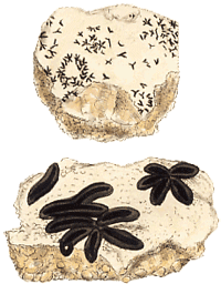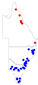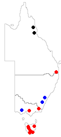 We'll start at the species level and consider four species. Metus conglomeratus has been found in parts of eastern Australia and New Zealand. The areas where it has been found in Australia are shown by the red dots on the map to the left. Myelorrhiza antrea and Neophyllis pachyphylla are known from limited areas of eastern Australia as you can see from that map (black dots for Myelorrhiza antrea and blue dots for Neophyllis pachyphylla) and Waynea hirsuta has been found only in the Tunkinksy Range near the southern end of Lake Baikal in central Siberia. The above evidence suggests that Metus conglomeratus evolved in Australasia and Neophyllis pachyphylla, being found only in widely separated areas of south-eastern Australia may have arisen there. When it comes to Myelorrhiza antrea it is harder to draw any conclusions since the species has been found only in such a limited area. The paper in which the species Myelorrhiza antrea was first described included the observation that "...it inhabits walls of caves where light can penetrate or in shaded rock crevices". Such places could easily be overlooked in a search for lichens so the species could well be more widespread, since much of tropical Queensland is still unexplored from a lichenological point of view. Similarly, based on the information given above, little can be said about Waynea hirsuta.