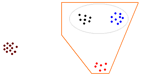 The examples given above have involved small genera, each with just a few species. At the other extreme are large genera such as Xanthoparmelia, which has several hundred species. Though a cosmopolitan genus its greatest diversity is found in the southern hemisphere, in Australia and southern Africa, particularly in open habitats of the arid or semi-arid areas. It's clear that there are various groups of closely related species, where the species within a group are more closely related to each other than to any other species of Xanthoparmelia. The following diagram represents this sort of situation. Every dot indicates a species and the shorter the distance between two dots, the more closely related are the two species represented by those dots. You can see that the black dots indicate one group of closely related species, the blue dots another group and so on. The grey ellipse around the black and blue groups indicates that these two groups are closer to each other than either is to any other group of species and you could think of the grey ellipse as denoting a super-group. This grey super-group and the red group are closer to each other than either is to the brown group over on the left and the polygon marks out a still larger super-group.