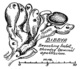 Bibby sent some specimens to the American lichenologist Carrol W. Dodge who replied that this was not a Siphula but a new genus and suggested that Bibby publish a formal description. However, by his death in 1955 Bibby had not published such a description. Willis took up the work and in 1956 formally published a description of the new genus, which he named Bibbya in honour of Bibby, with the one species in the genus taking the name Bibbya muelleri. Along with the formal written description of the new genus Willis included the drawing, reproduced here, which shows a small part of one specimen. On the basis of Bibbya's habitats and some species it resembled, Willis finished his paper with the observation that the...