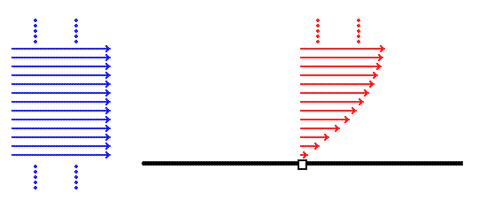 Case StudiesBoundary layersIt may seem strange to call a gas a fluid but, mathematically speaking, a moving gas has many similarities with a moving liquid. The study of flowing fluids is the subject of fluid mechanics and when a fluid moves over a solid surface a boundary layer arises. Fluids have viscosity. This is readily apparent in a very sticky fluid such as honey, You can see that honey tends to stick to itself as well as to any jar from which you're trying to pour it. Air is viscous as well, though much less so than honey, and also tends to stick to itself and to any surface it is in contact with. For any fluid in contact with a solid surface, the velocity of the fluid at the fluid-solid interface is the same as that of the solid. This is called the no-slip condition. The no-slip condition has some every-day consequences for it is part of the reason why dust accumulates on fan blades. Consider the following diagram, which shows a fluid flowing over a stationary black plate aligned parallel to the fluid flow. Before it reaches the plate the fluid is flowing uniformly. The equal length blue arrows on the left indicate that throughout its depth the fluid is moving at the same velocity and the dots indicate that there's much more fluid above and below. Call the velocity indicated by the blue arrows the free-stream velocity Now consider the point on the plate marked by the white square. The red arrows show a range of velocities (or a velocity gradient) within the fluid above that particular point. The longer the arrow the greater the magnitude of the velocity. Because of the no-slip condition the fluid in contact with the plate is still but well away from the plate the fluid is moving with the free-stream velocity. In between there is a range of velocities. Very close to the plate there is a low velocity, a little further away the velocity is a little greater, a little further away still the velocity is a little greater still and so on. Above the plate each point in the fluid has its own local velocity. If you joined up the tips of the arrowheads with a line you'd get a curve that you could call the shape of the velocity gradient for the point marked with the white square. In this scenario there's nothing special about the area above the plate. Below the plate you'd have a mirror image of what's happening above the plate. Velocity gradients are associated with the term boundary layer. Steven Vogel, one of whose books is the source of much of the information on this page, has written the following in the introduction to chapter 8 of that book: