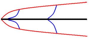 Given that X and µ are above the line, the larger these values are the greater the thickness of the boundary layer. On the other hand, since ρ and U are below the line, the larger these values are the smaller the thickness of the boundary layer. So, all other things being equal, the more viscous the fluid the thicker the boundary layer. For any given fluid and free-stream velocity, the further away from the leading edge of the plate, the thicker the boundary layer. In fact at the leading edge (where X has the value 0) the boundary layer has zero thickness. The red lines in the next diagram give you an idea of the shape of a boundary layer produced by the formula given above. The vertical distances are much exaggerated, given the size of the plate, but the diagram is qualitatively useful. You see that the boundary layer is steep near the plate's leading edge but less so downstream. The blue lines show the shapes of the velocity gradients at two points along the plate. The further downstream the 'flatter' the velocity gradient curves become. Some warningsYou'll occasionally see boundary layers referred to as areas where the air is still. As you can see that's not necessarily the case. Rather, they are zones where the effects of viscosity are significant. Strictly speaking it's even a little misleading to talk of THE boundary layer for a particular scenario. The use of the 99% factor in the definition above is very common but it is worth noting that some other definitions are in use. Depending on what viscosity-induced aspects you are studying you may find another definition far more useful for separating the 'viscous' from the 'non-viscous' regions. It's clear that the flat-plate scenario is simplistic - the real world is a much more complex place. Nevertheless the flat-plate scenario has an educational value. It allows an easy explanation of the development of velocity gradients from the no-slip condition and the derivation of a formula for the shape of a boundary layer. That in turn shows how some parameters influence boundary layers. The above discussion has been about laminar boundary layers where there is smooth flow over the surface. That's sufficient for this website. There are also turbulent boundary layers, which are much more complex. Finally, the discussion has assumed that the fluids are "everyday" fluids, such as air or water, in the various habitats that cover the earth's surface. There are more esoteric fluids (for example, very low density gases) or environments (such as very high altitudes) for which not all the above comments hold. Lichens and boundary layersBoundary layers are highly significant for small organisms that live their lives on surfaces since such organisms spend much of their time living within the boundary layers of some surface or other. For example, many crustose lichen thalli are raised very little above their substrates and so a crustose thallus is likely to lie within the substrate's boundary layer. Very slowly moving air is a good insulator and is also good at slowing the diffusion of molecules. Water that evaporates from a moist surface moves slowly through the neighbouring boundary layer, thereby prolonging the local period of humidity and so helping any nearby lichen remain hydrated and able to photosynthesize. Think of a rotting log on which some lichens are growing. The fungi that are rotting the log are breaking down complex organic molecules and releasing carbon dioxide. In the boundary layer over the log, given the slow diffusion of carbon dioxide, the carbon dioxide concentration can be much higher than that of the ambient air, giving the lichens an enhanced supply of the raw material of photosynthesis. On February 2 1989, after some days of relatively warm winter temperatures, a cold Arctic air mass that had spread southward into North America caused a rapid temperature drop to minus 25 degrees Celsius in parts of Colorado. This sudden cold change caused severe frost damage to plants and also to lichens growing on exposed boulders. At a lichen study site in Colorado it was estimated that the cooling rate could have been between 5 and 10 degrees Celsius per minute. A rate of 10 degrees per minute is fatal to most plant, animal and microbial cells. Before that rapid cooling many of the lichens on the boulders would have been metabolically active (and so more susceptible to damage) rather than dry and dormant. An investigation at the study site showed that the foliose lichens suffered badly, with many thalli being killed, but the low-growing crustose species suffered little. The foliose thalli on a boulder would have projected above the boundary layer that was warmed by heat stored in the boulder. Such severe frosts, though uncommon in the study area, could be expected to occur during the lifetimes of most lichen thalli and severe frost damage to the faster-growing foliose lichens would allow the slower-growing, but less frost-susceptible, crustose species to compete successfully on exposed boulders. Boundary layers are helpful to lichens but they also create hurdles that need to be overcome. If spores are to be wind-dispersed there's no point releasing them into the boundary layer, for they'd go virtually nowhere. It is necessary to get the spores into the turbulent or faster moving air beyond the boundary layer. In many species of apothecial or perithecial lichens the spores are ejected forcibly from the asci and shot some distance into the air, beyond the boundary layer of thallus or substrate. For example, the authors of one of the references listed below report Ramalina spores being ejected a distance of 4 to 10 millimetres, easily beyond the 1 to 2 millimetre boundary layer over an apothecium. Another way in which to help wind dispersal of propagules get beyond the boundary layer of the substrate is to produce them on raised structures. You find such raised structures on a variety of ascolichens and also in the basidiolichens. The stalk