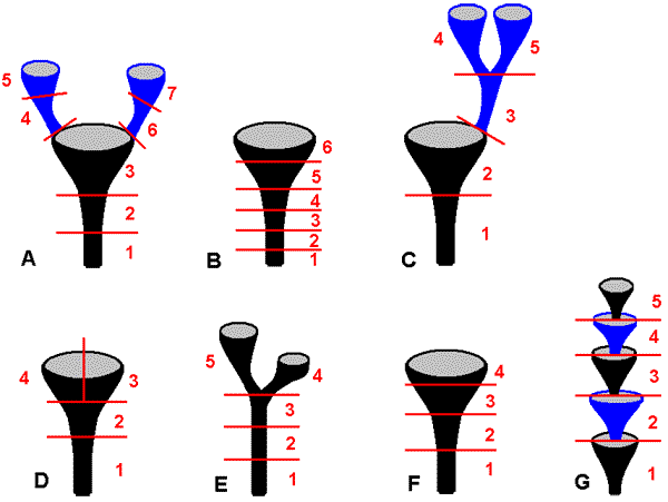 Case StudiesCladonia - quantitative chemical distributionsAlan Archer's paper listed below reports on the quantitative distributions of various lichen compounds in the thalli of specimens of several species of Cladonia. In this genus the thallus develops initially as a squamulose growth form (referred to as the primary thallus) and the primary thalli later produce upright stems, the podetia, as fruticose secondary thalli. The podetia take various forms, depending on species. The specimens tested in the study belonged to what are called scyphiferous species. In such species a podetium expands at the apex into a scyphus, a shallow-cup-like structure. Depending on the species, from such a scyphus a further podetium may develop, which in turn produces a scyphus and so on. The following figures, diagrammatic rather than being to scale, show some of the possibilities. In the study each specimen was cut into sections and the chemical concentrations in each section were analysed. The red lines in the above figures show how the seven specimens were partitioned and the specimens involved were identified as:
