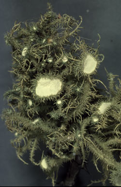 The year 1944 saw the first published report of the discovery of antibiotic compounds in lichens. In that paper the authors found that 27 of the 42 lichen species they studied produced compounds that were effective against Staphylococcus aureus or Bacillus subtilis, four produced compounds that inhibited Proteus vulgaris or Alcaligenes fecalis but none of the tested lichen extracts inhibited Escherichia coli. Since that time many secondary metabolites have been shown to have antibiotic properties. This has been demonstrated in laboratory tests, with the metabolites generally most effective against fungi and gram positive bacteria. It is very likely that such compounds help protect lichens against a variety of micro-organisms in the wild, and so contribute significantly to the long life of many lichens, but there has been very little study to see what effects such compounds have in a natural setting. Laboratory studies have shown that several lichen metabolites inhibit the germination of, or the post-germination growth from, spores of various moss species. However various factors influence the toxicity of particular lichen metabolites. For example in laboratory studies that used the moss Funaria hygrometrica as a test subject, the toxicity of some lichen metabolites increased with increasing acidity but in others toxicity decreased with increasing acidity. Lichens and mosses grow on a variety of substrates, some of which will be more acidic and some more alkaline. Thus the nature of the substrate would influence the moss-inhibiting effectiveness of various lichen metabolites. Metabolites produced by some lichens may inhibit the growth of other lichens. An examination of a site in then Czechoslovakia found a species of the genus Lepraria growing on thalli of Xanthoparmelia loxodes and Xanthoparmelia verruculifera. Though the Lepraria was found on both Xanthoparmelia species, statistical analysis (which took into account the different numbers and sizes of the Xanthoparmelia thalli) showed a distinctly non-random distribution, with Lepraria overwhelmingly associated with Xanthoparmelia verruculifera. The host species were quite different chemically and the most plausible explanation for the non-random Lepraria distribution appeared to be chemical inhibition by Xanthoparmelia loxodes, even though the authors of the report about this phenomenon didn't carry out any laboratory experiments to test the chemical inhibition hypothesis. Chemical inhibition of mosses and other lichens would be advantageous given that they are often direct competitors for substrate. The secondary metabolites may also protect lichens against herbivorous invertebrates. Laboratory tests have shown that a number of invertebrates will avoid various lichen metabolites and that some lichen metabolites will induce slower growth rates in the invertebrates that have consumed them. Such compounds give clear survival benefits to the lichens involved