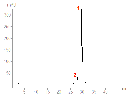 For more detailed analysis thin-layer chromatography (TLC) or high performance liquid chromatography (HPLC) are used. Depending on the type of chromatography an acetone extract from a lichen fragment is made to move in a solvent along a thin layer of silica gel on a firm supporting plate or through columns packed with tiny, spherical silica particles. Different lichen substances in the acetone extract move at different rates in the solvent and so become separated from each other, thereby allowing analysis and recognition of the different substances in a given lichen fragment - including substances that are present in low concentrations. That is a very simplistic description of chromatographic technique and anyone wanting more details will find them easily on the web via any search engine. All that matters here are, first, the basic principle and, second, that chromatographic methods (in particular HPLC) allow detailed analysis of the substances - not only what substances are present but also their relative proportions so seeing which are the major and which are the minor secondary metabolites in a particular lichen. The output of a HPLC system is typically a chart such as the following.