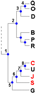 A tree such as this shows the species' evolutionary relationships, or phylogeny, but a phylogenetic tree is not itself a classification, though it can suggest possible classifications. In this example you might argue that there are three obvious genera here, namely the groups (QOD), (BPR) and (CUJSG). Someone else may argue that rather than three genera there should be just two, with the first two of the above three groups defined as the one genus. Each of those ideas is justified by the evidence presented by the diagram. A monophyletic group is defined as one consisting of an ancestor and all its descendants. Hence the group (3,4,Q,O,D), of which only the last three are extant today, is an example of a monophyletic group. If a classification is to be consistent with phylogeny then only taxa consistent with monophyly would be accepted. Hence (D,O,Q) would be an acceptable genus, as would be the other suggestions for genera just given. At an earlier level of knowledge the trait of RED may have been thought a significant feature and hence used to help define a genus consisting just of C, J and S. Current knowledge, as presented by the diagram, shows that RED is not a significant indicator of evolutionary closeness since C is closer to the non-RED U than to the other RED species. On the basis of the evidence presented by the diagram (C,J,S) is not monophyletic since the most recent common ancestor, 6, also has U as a descendant. The group (C,J,S) is paraphyletic - meaning that it does not include all descendents of the group's most recent common ancestor.