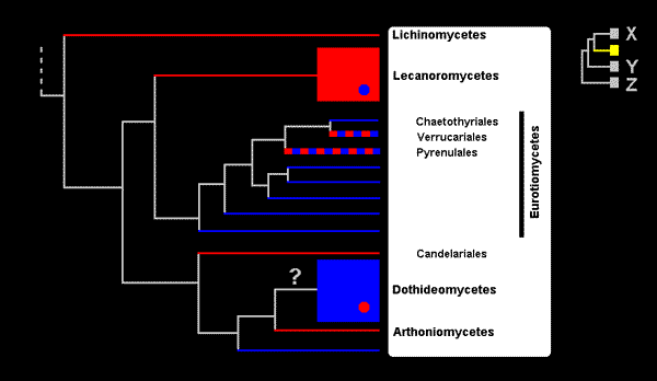 The figure is in two parts. The large tree on the left shows the classes that contain lichenized fungi with one class, Eurotiomycetes, given in more detail, the orders within that class being shown and three of them named. If a taxon consists only of lichenized fungi then it is shown as a red line. A taxon containing only non-lichenized fungi is shown by a blue line and taxa in which both lichenized and non-lichenized fungi are found are shown in red and blue. The lines for the latter are drawn thicker, simply to show the bicolouring more easily and the line thickness has no other significance. The class Lecanoromycetes consists almost totally of lichenized fungi but there is a small number of non-lichenized species within the class, hence the blue dot within the Lecanoromyctes. This class contains the majority of the lichenized fungi (containing about 14,000 of the approximately 18,000 known lichen species). The Dothideomycetes is the largest class within the ascomycetes and contains about 19,000 species - but only a small number of lichenized species. The Verrucariales and Pyrenulales consist mostly of lichenized fungi. The yellow area in the small tree to the right shows where the large tree fits into the tree of all ascomycetes. As you can see there are three other groups of ascomycetes, all non-lichenized, and they have been labelled X, Y and Z. The first of those groups contains about 18,000 species while Y and Z, combined, contain about 3,000.