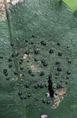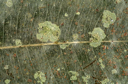 Leaves do not form a static habitat. They emerge, grow in size and after some time fall off. As a plant grows in height or bulk leaves that were once exposed to light can become shaded. Water running off higher leaves may carry leached nutrients to the lower leaves. These and other factors can work to create a variety of changing MICROHABITATS. Wilkiea macrophylla is found in rainforest areas from northern Queensland south to New South Wales. In the rainforests of south-eastern Queensland the species is common as a shrub or small tree in the understorey and the leaves, which are about ten centimetres long and four centimetres wide, with a mean half-life estimated at 6.8 years. In one study leaves of various ages were collected and their lichen cover analyzed. Aderkomyces albostrigosus and Sporopodium xantholeucum appeared to be pioneer lichen species on young leaves. Though other species also could begin colonization of young leaves at the same time, the evidence suggested that those two matured more quickly and showed best thallus development when thalli of other species were not growing close by. Older leaves showed good growth by Porina epiphylla, Porina impressa and Mazosia melanophthalma. Separate thalli of Porina epiphylla could fuse to create larger, composite thalli - and similarly with Porina impressa. On well-colonised leaves Aderkomyces albostrigosus and Sporopodium xantholeucum were less frequent and their thalli appeared less healthy. Thalli of Mazosia melanophthalma grew as discrete, round patches but showed no signs of necrosis when surrounded by Porina. This Mazosia species therefore appears better able to withstand competition than do Aderkomyces albostrigosus and Sporopodium xantholeucum. Strigula orbicularis and Strigula subtilissima establish at leaf wounds. Since the probability of leaf damage increases with leaf age it's not surprising that the Strigula species appeared with greater frequency on older leaves. Lichen cover varied greatly from leaf to leaf and between taxa. Coverage could reach 100% of the leaf surface, though rarely. Generally coverage increased with leaf age and the older leaves had a mean coverage of about 50%. The greatest observed percentage coverage by a single species on any one leaf was an instance where Porina epiphylla covered 78% of one leaf surface, but this was an extreme. For example, on the older leaves mean coverage by this species was about 30%. At the other extreme there were a number of species where each had a maximum coverage of under 10% of the leaf surface. Incidentally, the studies of Wilkiea macrophylla showed that lichens made a distinction between the two leaf surfaces. Lichens were found only on the morphological upper surface of the leaf even if, by some accident, a leaf had been inverted to leave the morphological lower surface facing upward