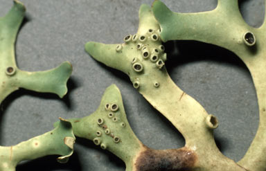 Vagrant lichens appear to produce apothecia rarely. In a paper of 1993 the author noted that amongst the seven vagrant species of Xanthoparmelia found in North America only two (Xanthoparmelia chlorochroa and Xanthoparmelia camtschadalis) had been reported with apothecia and then very rarely. Reproduction was by unspecialized fragmentation. The photo (right) shows apothecia of Xanthoparmelia semiviridis but they are rarely found, though thallus fragments can be found often. Amongst the other vagrant Xanthoparmelias found in Australia rare apothecia have been found only on Xanthoparmelia convoluta and Xanthoparmelia sorediata. In the early years of the 20th century the Russian lichenologist Konstantin Mereschkowski collected vagrant lichens in the Crimea. He stated that he'd collected several thousand specimens of vagrant Parmelia and had seen even more but had never come across a single specimen with an apothecium and nor had he ever seen soredia. Reproduction was by a thallus breaking into two or three pieces. With regard to Aspicilia fruticulosa Mereschkowski reported finding apothecia on only two or three specimens of the over ten thousand he'd seen. No apothecia have been reported for Xanthomaculina convoluta which may reproduce by irregular fragmentation or by the phyllidia found on the thalli. A phyllidium is a small, leaf-like projection from the thallus, with distinct upper and lower surfaces and often constricted at the base, easily broken off and discarded to function as a vegetative propagule. Masonhalea richardsonii (a vagrant species of Siberia, Alaska and northern Canada) has rarely been found bearing apothecia