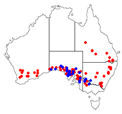 ) and found mostly in Australia's southern half. The accompanying map shows the distribution of Xanthoparmelia convoluta (blue dots) and Xanthoparmelia semiviridis (red dots). The latter is the most widespread vagrant species in Australia and is also found on New Zealand's South Island