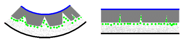 The thallus of Xanthomaculina convoluta, a species endemic to the coastal fog zone of the Namib Desert, has a structure with some resemblance to that of Xanthoparmelia semiviridis. The hyphae of the cortex are densely packed and the medullary hyphae are loosely packed. However there are intrusions of the medulla and the algal layer into the upper parts of the thallus so that (unlike the case in Xanthoparmelia semiviridis) the cortex is not continuous. The following pair of stylized diagrams show cross sections of a thallus when dry (left) and when wet (right). The upper cortex has two layers. The upper layer, called the epicortex, is thin and shown in blue. Below is the bulk of the cortex (in dark grey), the algal cells (green), the medulla (speckled light grey) and the lower cortex (black).