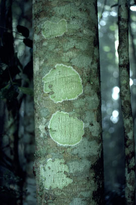 An important aspect of lichen ecology is the concept of microhabitat. When people talk about habitats they often think on a large scale and say things such as "This is a rainforest plant" or "This animal lives in arid saltbush country". Such large scale habitat descriptions are important in lichen study for there certainly are lichens that you will find only in rainforests and others that are confined to arid landscapes. However you must also think on the small scale. Some rainforest lichens grow only on bark, others only on leaves - two distinct microhabitats in a rainforest. The previous section noted that some lichens require acidic substrates, others alkaline ones. Think of a rock wall in a city park, composed of acidic rocks held in place by concrete (which is alkaline). You may find the rocks are host to various lichen species that will not grow on the concrete and vice versa. Again, two distinct microhabitats. There's more about all this on the HABITATS page.
