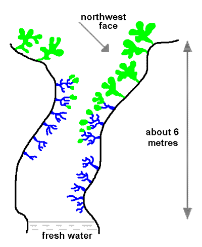 The branching blue structures indicate the fruticose 'Dendriscocaulon' form of Sticta filix and the green lobed bits indicate the foliose form. The lichens are growing from the surfaces of two very large boulders that have a narrow gap between them. The boulders are in the spray zone of a small waterfall which may have considerable flow when the nearby river is in full spate. The boulders are shaded by overhanging trees but the upper areas may receive up to five hours of sunshine per day, between October and May. The lower parts of the boulders are in permanent shade. A total of 93 thalli were found (24 algal, 38 cyanobacterial and 31 composites) distributed in the zones as indicated by the above diagram (by green, blue and blue-&-green respectively). Apothecia were found only on some of the upper thalli with the algal photobiont. The evidence suggests that by being able to combine with both an alga and a cyanobacterium the fungus can occupy a wider range of habitats than it would be able to do if it combined with only one type of photobiont