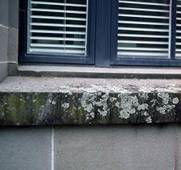 Mixed lichens on concrete showing an inhibition zone in the drip-line below a handrail |