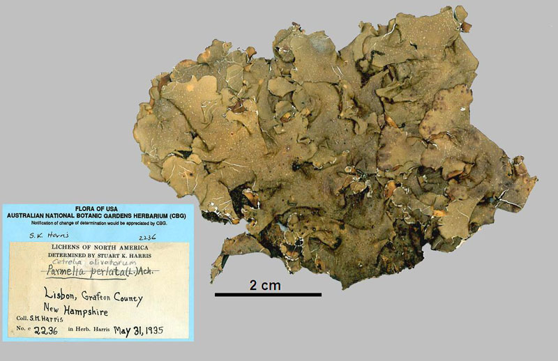 Originally this specimen was identified as Parmelia perlata by the collector (Stuart K. Harris) but as you can see that name has been crossed out and Cetrelia olivetorum written in pencil. Inside the packet there is a note that the specimen was re-identified as Cetrelia olivetorum in 1981 by the American lichenologist Clifford W. Wetmore.