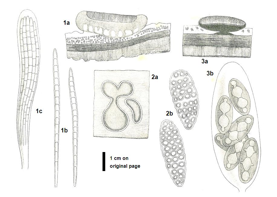 1a. section of an apothecium (40x), 1b. spores (950x), 1c. ascus with spores (950x)