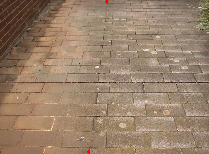Lichens on a paved area alongside the Cryptogam Herbarium, CanberraThe pavement to the left of the line joining the two red dots is under the overhang of the floor above, shown here.