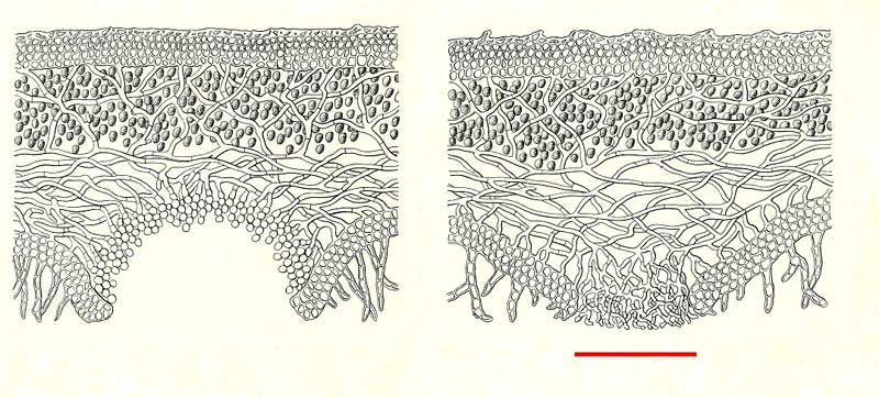 In the left hand illustration you can see a cyphella, its recessed surface formed by a "pseudo cortex" of cells markedly different from both those of the lower cortex and the hyphae of the medulla. On the right (indicated by the red bar) is a slightly convex pseudocyphella, where medullary hyphae protrude through a gap in the lower cortex. Those hyphae, though well-branched, are essentially undifferentiated from the rest of the hyphae in the medulla