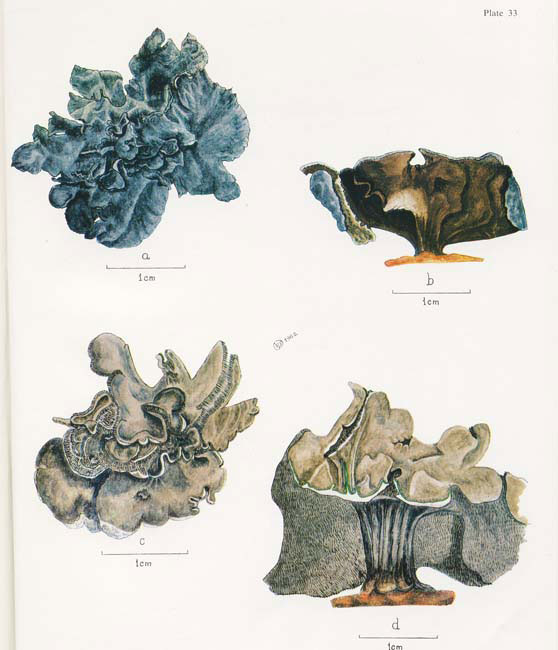 Plate 33 from Rex Filson's The Lichens and Mosses of Mac.Roberston Land.These paintings show two species of Umbilicaria, though in Filson's book the upper pair of figures was captioned as Omphalodiscus decussatus and the lower pair as Omphalodiscus antarcticus. Research has shown that the genus Omphalodiscus is identical with Umbilicaria, which has priority. The upper pair of figures would show Umbilicaria decussata, but determining the caption for the second pair of figures is not quite so straightforward and is discussed in the ANTARCTIC UMBILICARIA CASE STUDY.