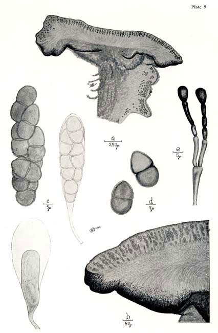 Microscopic views of various features of Buellia grimmiae. Figure (a) shows a cross section of part of a specimen and (b) shows an enlargment. In both you can make out a number of spore-bearing asci. Asci are shown larger and in various stages of development in (c), while (d) shows some mature spores and (e) a branched paraphysis.