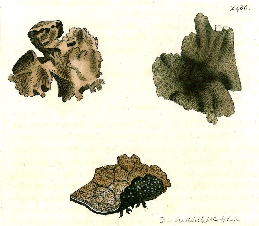 Gyrophora murina - James Sowerby's illustrations of 1812 for English Botany. The underside is darker. The lower picture shows an enlarged detail.