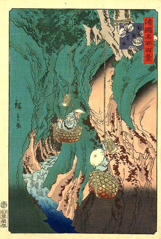 In transliterated Japanese the title of the picture is Kishū Kumano iwatake tori and is part of the series Shokoku meisho hyakkei (100 famous views in the various provinces) by the woodblock artist Chinpei Suzuki (1829-1869). He is also known as Hiroshige II for he was the student and adopted son of the artist Utagawa Hiroshige (1797-1858), whose name he took after his master's death. The picture was published in 1860 and measures about 36 x 24 centimetres.