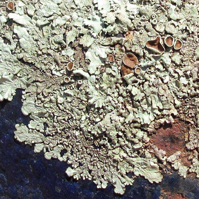 Part of a Xanthoparmelia thallus growing on a discarded kettle tip near Parkes, New South Wales. There's a view of the whole kettle here.