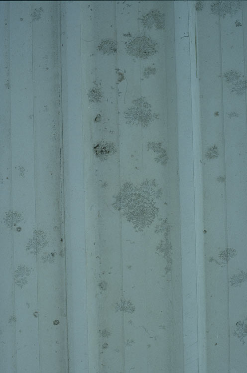 Ghosts of departed lichens. The patterns on this metal fence were left after lichen thalli were removed