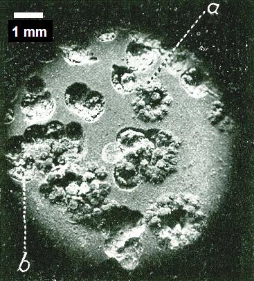 This photo shows a small part of a glass surface. You can see a number of pits as well as areas of smooth, uncorroded glass. The letter "a" indicates the rosette-like growth of a lichen thallus that has established itself within one of the corrosion pits. Mellor identified this lichen as Placodium murorum var. cinnabarinum by Mellor. There are different levels of lichen growth within some of the other pits as well. The letter "b" indicates a corroded area with an irregular outline.