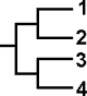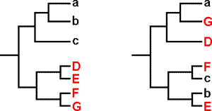 Most people would be aware that over the last few decades genetic testing has become very common and it is used in taxonomy. This issue is discussed at greater length on the CLASSIFICATION page so there will be the briefest of explanations here. Essentially, there are techniques for determining how similar is the DNA of various species. Suppose we have four species and we've found that the DNA of species 1 is very similar to that of species 2, that of species 3 is very similar to that of species 4 but that there are significant differences between the 1,2 pair and the 3,4 pair. We could present these findings visually by the diagram on the right, reminiscent of a human family tree. Now, suppose there are two lichen genera (X and Y) that have been defined on the basis of chemistry and morphological features. Suppose X has three species (call them a, b and c) while Y has four species ( called D, E, F and G). If, after DNA analysis we have a diagram like the left one of the following pair we'd conclude that the DNA evidence supports the idea of X and Y being two distinct genera. On the other hand, if the tree on the right resulted we'd say that the DNA evidence does not support the idea of X and Y as distinct genera since the species are intermixed in the second tree.