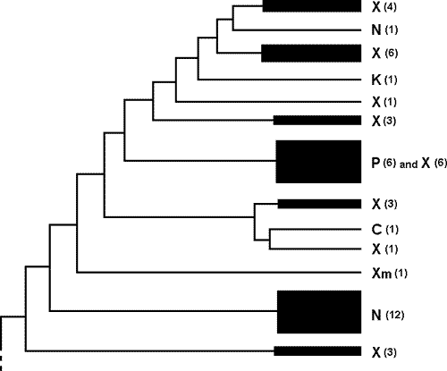 DNA analysis of specimens of 58 parmelioid species was published in 2004 and the following diagram is a simplification of part of a figure that appeared in that paper. In the original each species is indicated separately but in my diagram I have used black blocks to indicate that a number of species of the one genus group together at that point and so I do not present all the fine detail of the original. The letters indicate these genera: C=Chondropsis, K=Karoowia, N=Neofuscelia, P=Paraparmelia, X=Xanthoparmelia and Xm=Xanthomaculina. Karoowia and Xanthomaculina had been defined in the 1980s and, like Chondropsis, had not been segregated from Parmelia. The bracketed numbers indicate the numbers of species grouped at each point.